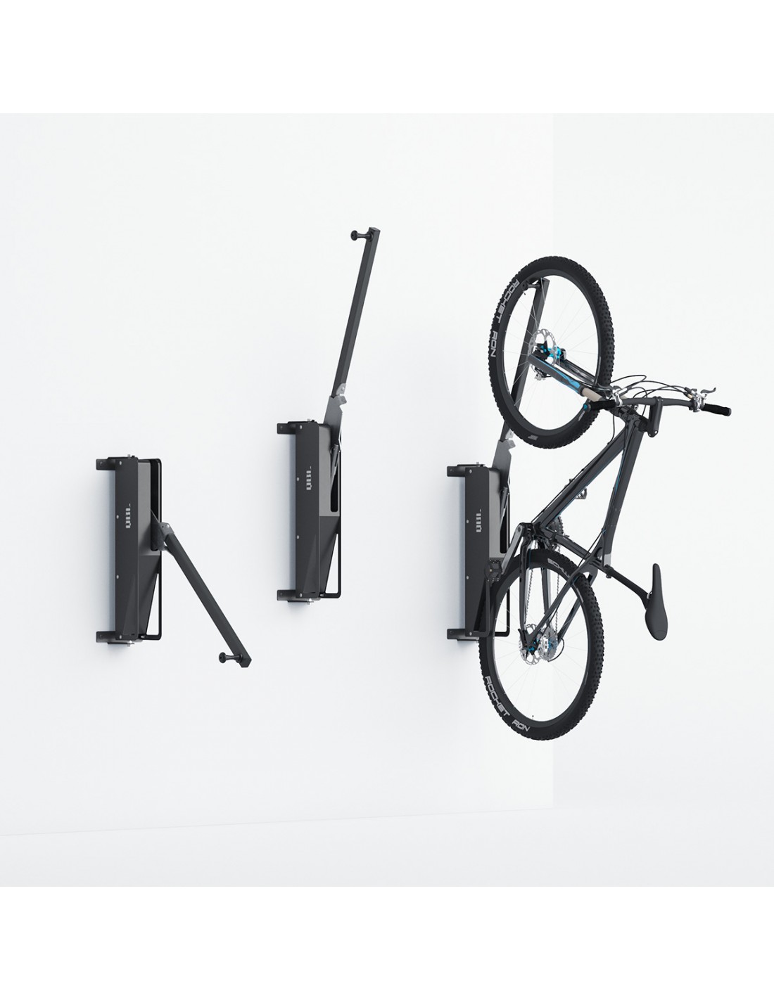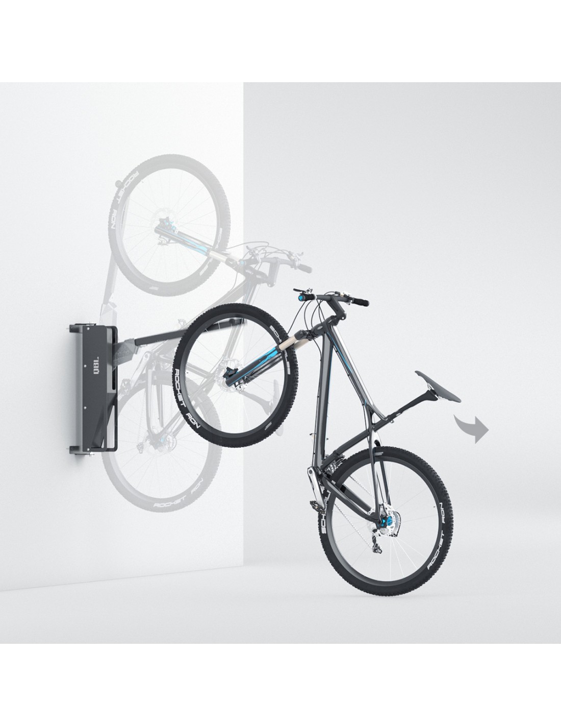 Pentru a economisi și mai mult spațiu, suportul este prevăzut cu un mecanism de pivotare care vă permite să înclinați bicicleta pe care o țineți spre perete.